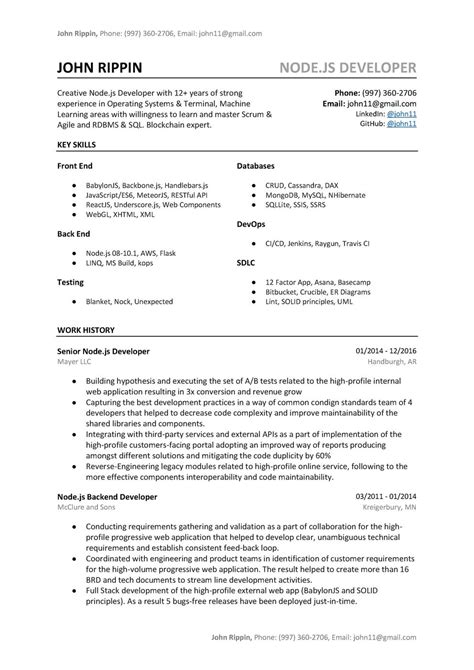 Node Js Developer Sample Resume . Crafting a resume as a node.js developer means showcasing technical skills and project experience. As a node.js developer, your resume needs to show strong skills in javascript, express.js, and backend development.